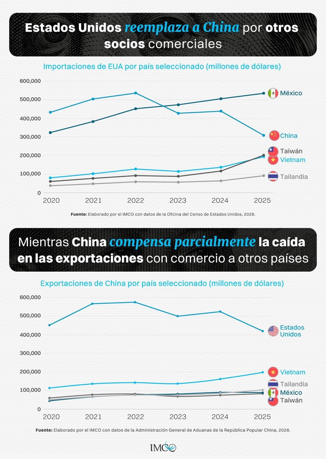 Las tensiones comerciales entre Estados Unidos y China no han reducido el comercio global, sino que lo han reconfigurado. Desde 2020, las importaciones estadounidenses provenientes de China han disminuido, mientras aumentan las de economías como México, Vietnam, Taiwán y Tailandia. Al mismo tiempo, China ha incrementado sus exportaciones hacia estos mismos países. Aunque los datos no permiten identificar con certeza los mecanismos detrás de estos cambios, algunos analistas han señalado la posibilidad de uso de países intermediarios para redirigir mercancías (transshipment) en el marco de las tensiones. Más allá de esta interpretación, la evidencia refleja una transformación en la geografía del comercio internacional impulsada por la rivalidad entre las dos principales economías del mundo. Países como el nuestro se benefician de esa relocalización de flujos comerciales |