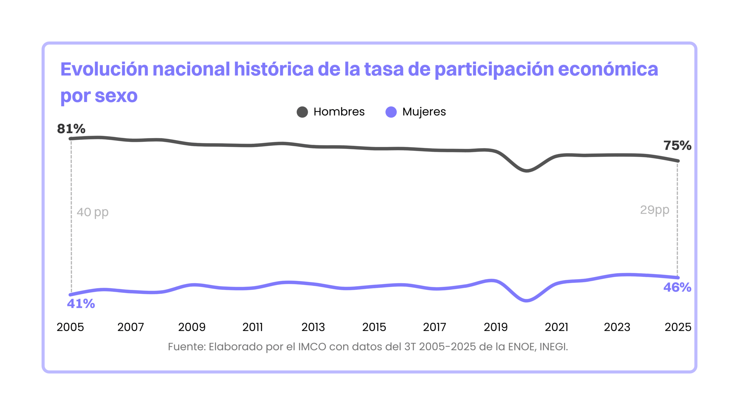 Aunque la brecha entre hombres y mujeres alcanza 29 puntos porcentuales (pp), esta se redujo en 11 pp durante este periodo. Esta disminución se explica tanto por el aumento gradual en la participación de las mujeres (tasa de crecimiento anual promedio de 0.5%) como por una reducción en la de los hombres (-0.4%).
