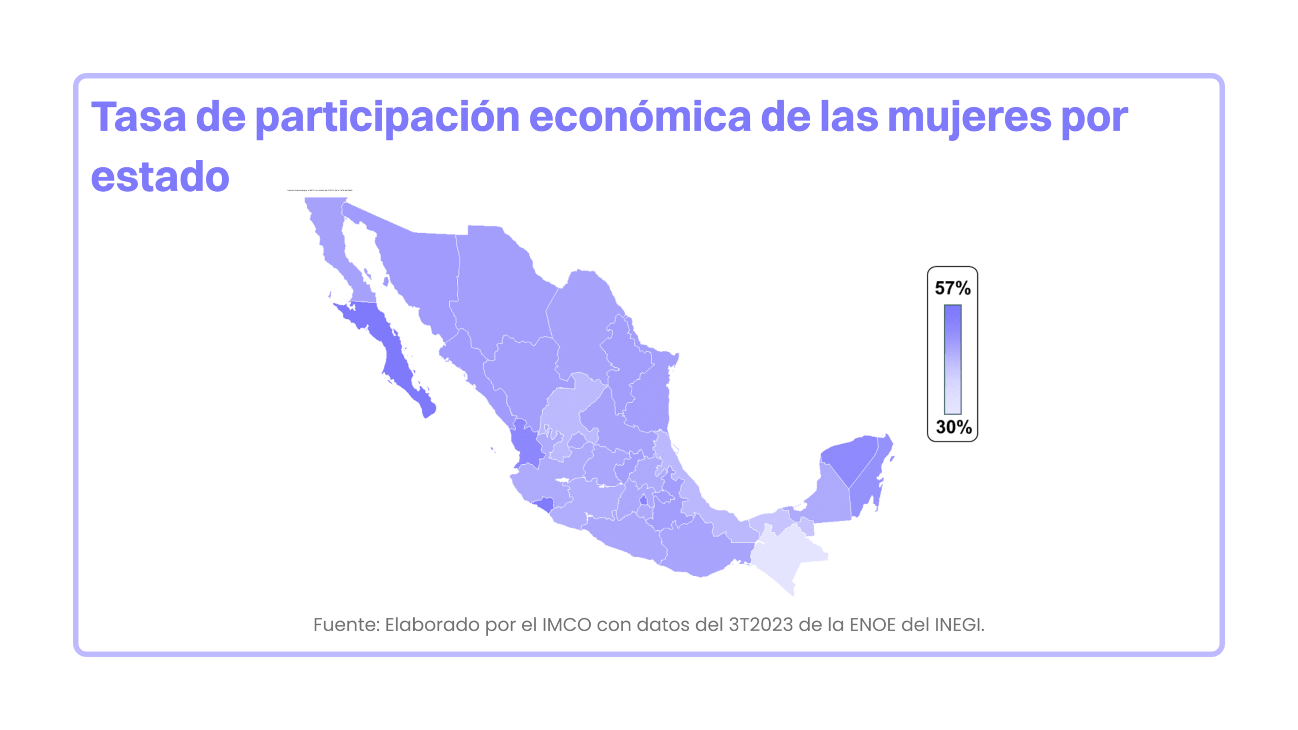 Seis entidades registran una tasa de participación económica de las mujeres superior a 50%: Baja California Sur, Colima, Ciudad de México, Nayarit, Yucatán y Quintana Roo. Mientras que, en el otro extremo con menor participación, se encuentran Veracruz y Zacatecas con una tasa de 41%, así como Tabasco (38.5%) y Chiapas (30%).