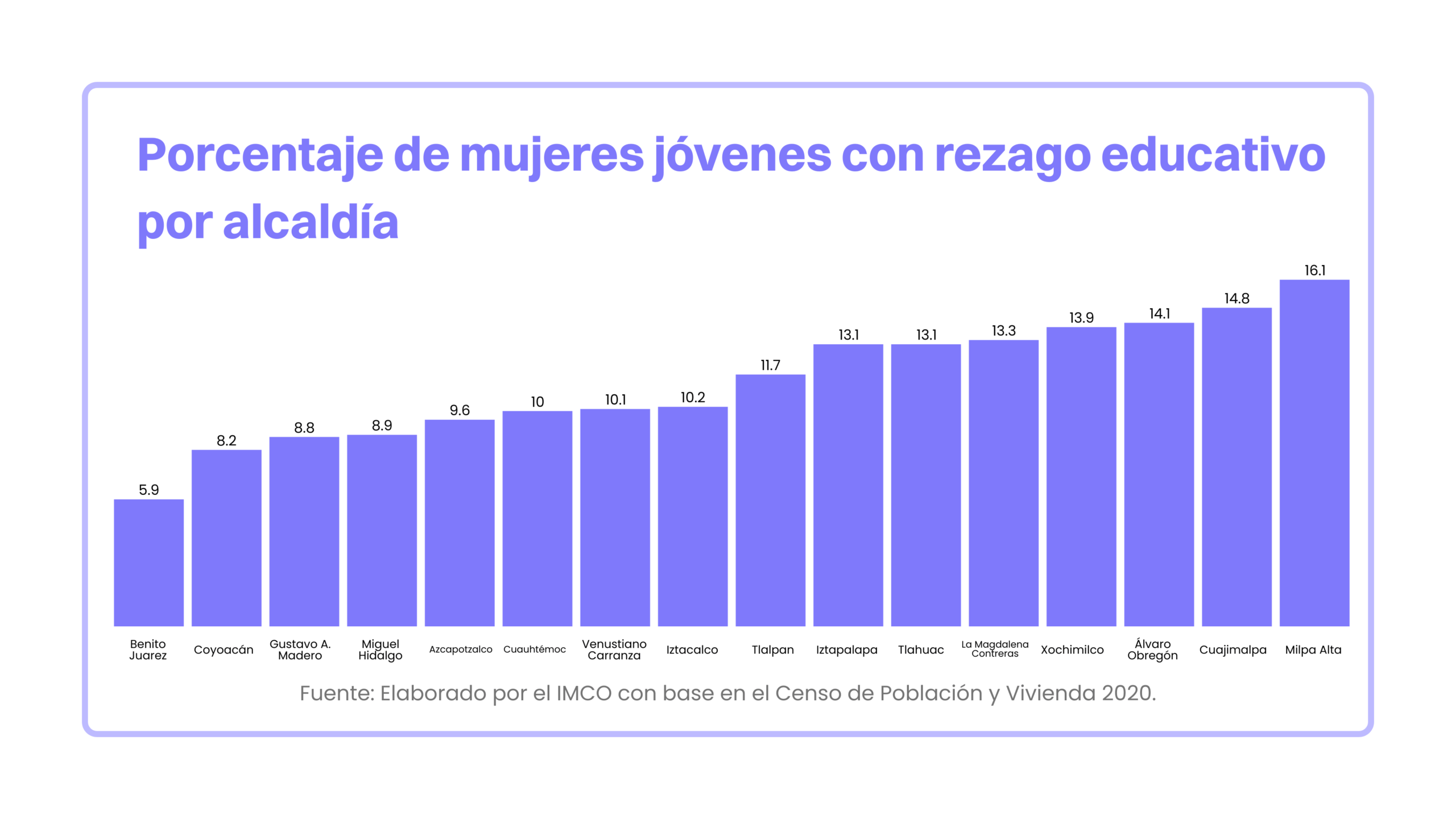 - Las alcaldías con menor rezago educativo entre las jóvenes tienden a registrar una mayor participación económica. Por ejemplo, en Coyoacán, 8% de las mujeres jóvenes no concluyó la educación obligatoria en la edad esperada y 57% participa en el mercado laboral, lo que coloca a la alcaldía en la segunda posición en ambas variables.